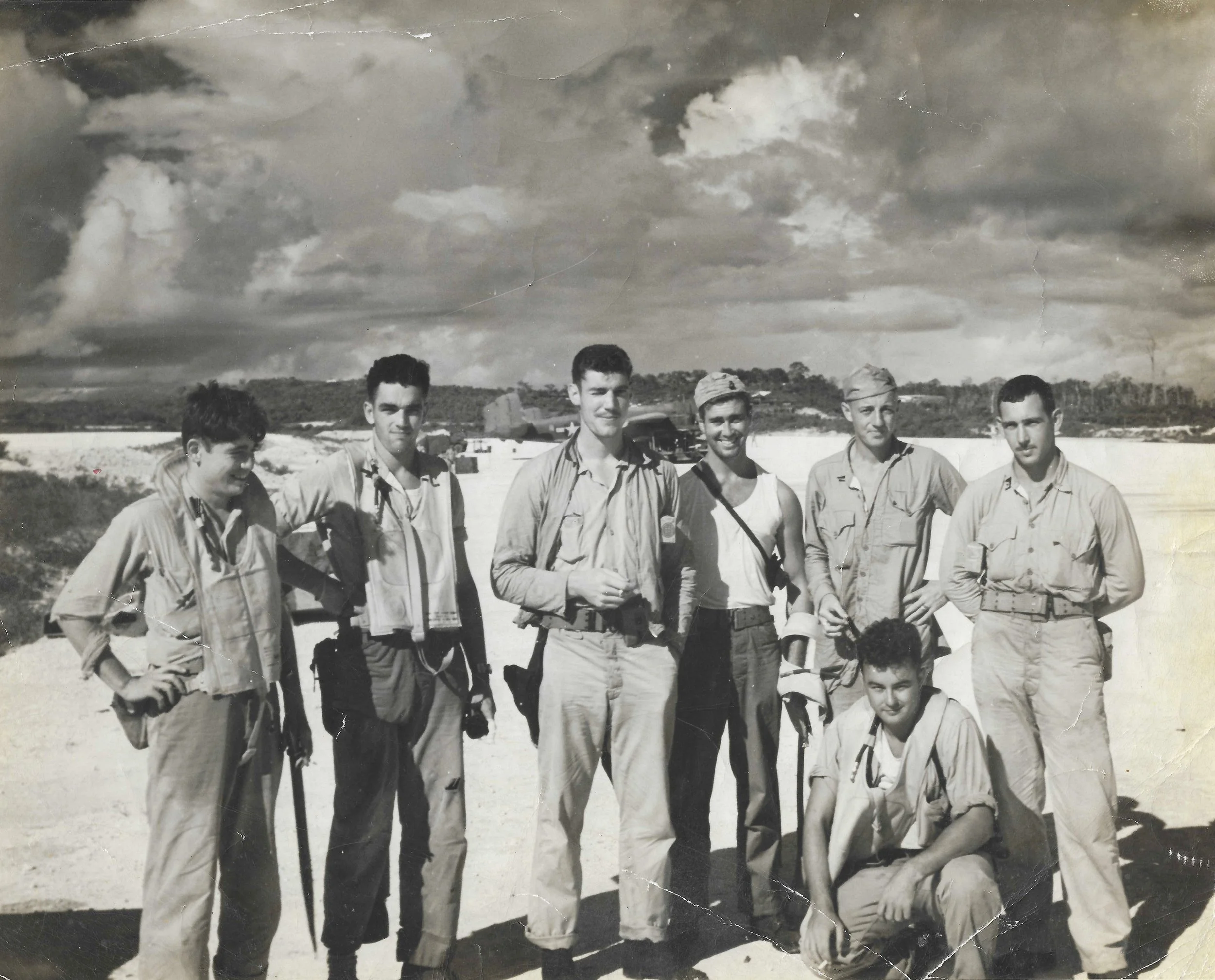 Jim Merriman is on the far right. Second from right, standing, is Bob Millington, the pilot. This photo was taken immediately after the crew was picked up after hours floating in the Pacific.